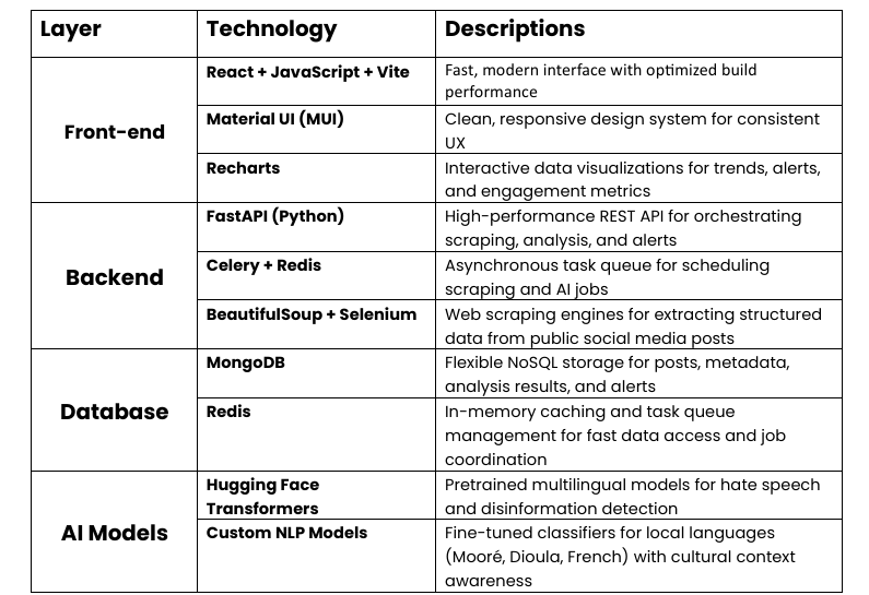 - Prétraitement du contenu : détection de langue (FR, Mooré, Dioula, EN), nettoyage du texte, analyse multimédia (images/vidéos).