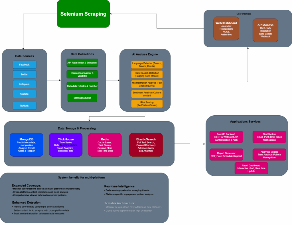 Un système basé sur des mots-clés capable de rechercher simultanément sur toutes les plateformes sociales, collecter les données de publications avec leurs métriques d’engagement, puis utiliser l’IA pour détecter les discours de haine et la désinformation à travers le paysage numérique du Burkina Faso.